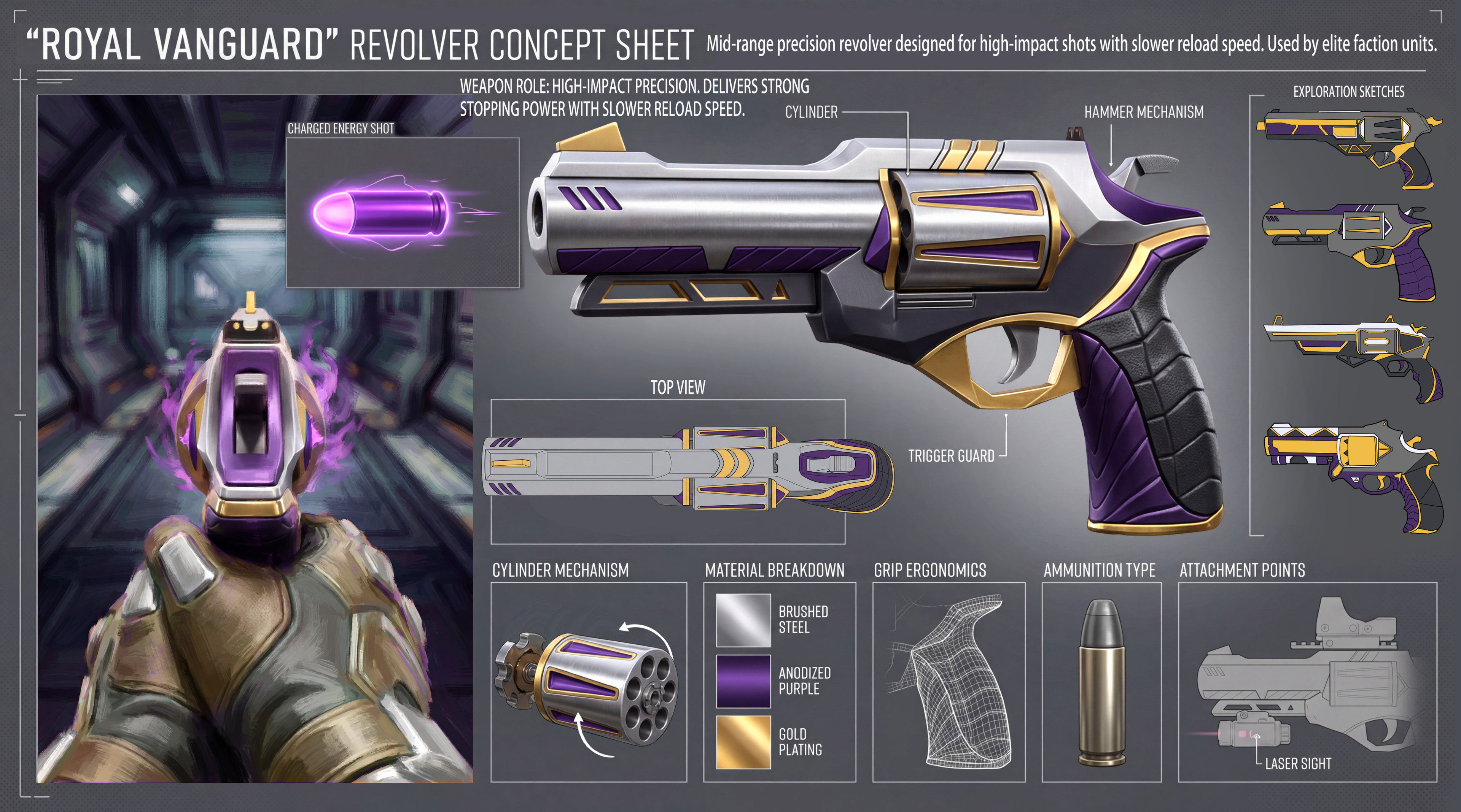 Revolver concept designed for a stylized sci-fi setting, focusing on gameplay role and in-game readability.