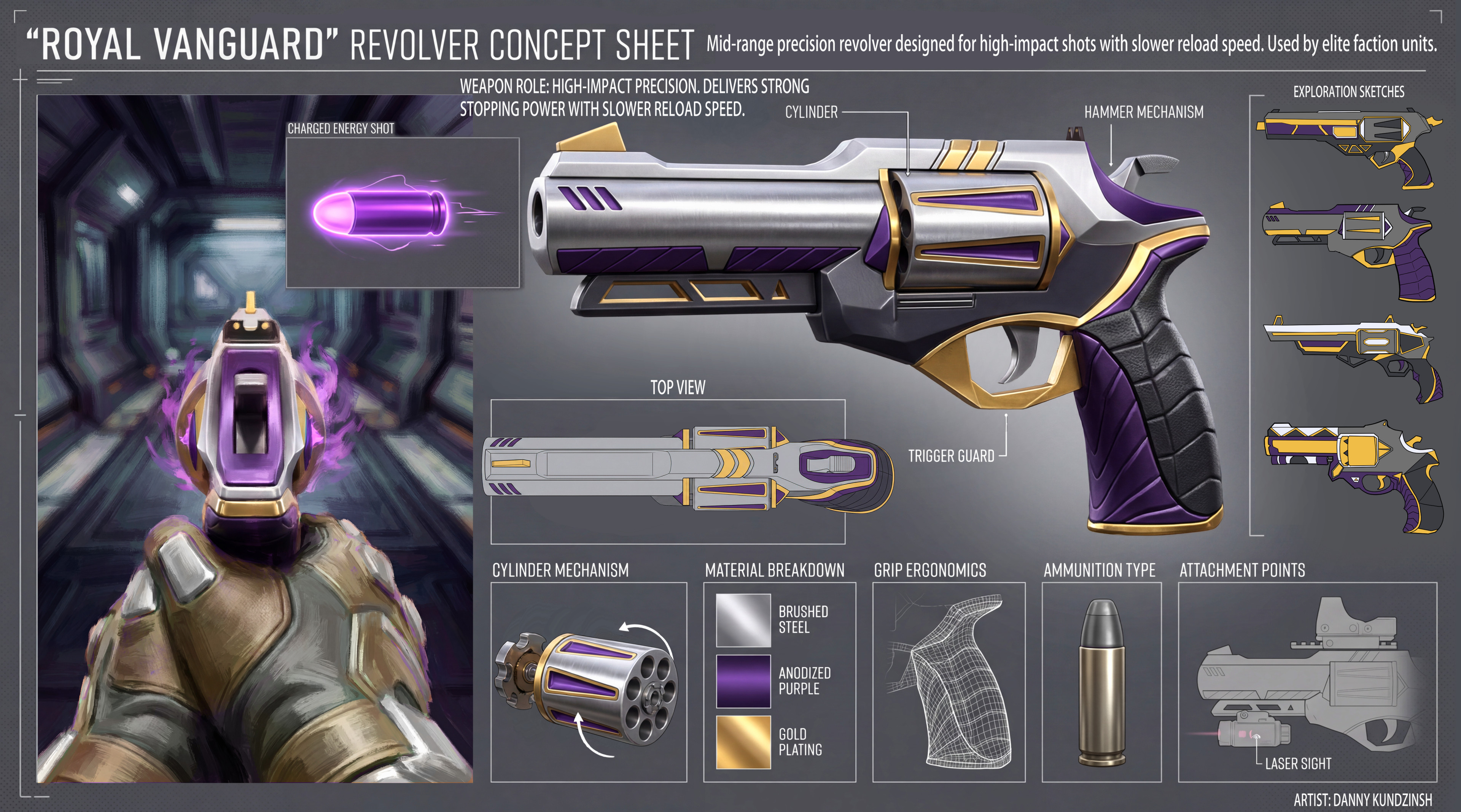 Revolver concept designed for a stylized sci-fi setting, focusing on gameplay role and in-game readability.